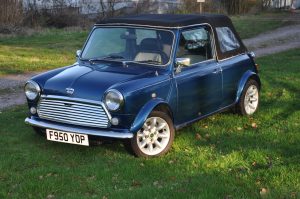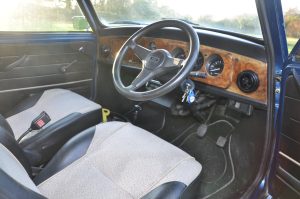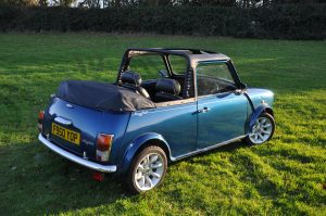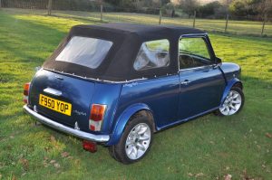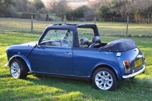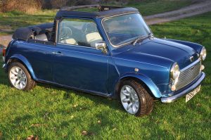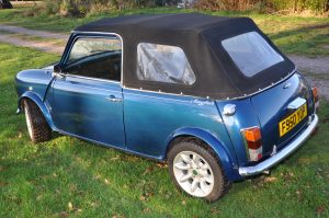 “Bluebelle” is a 1988 (registered very early in January 1989) Austin Mini Mayfair Automatic. She is fitted with a completely standard 998cc A+ engine and Mayfair 2.76:1 final drive. Her interior has a mk5 leather interior, along with walnut dash. Finished in a “Fantasy Blue Pearl” paint scheme with a mohair hood and cream piping to match the interior, she looks fantastic in the summer sun.