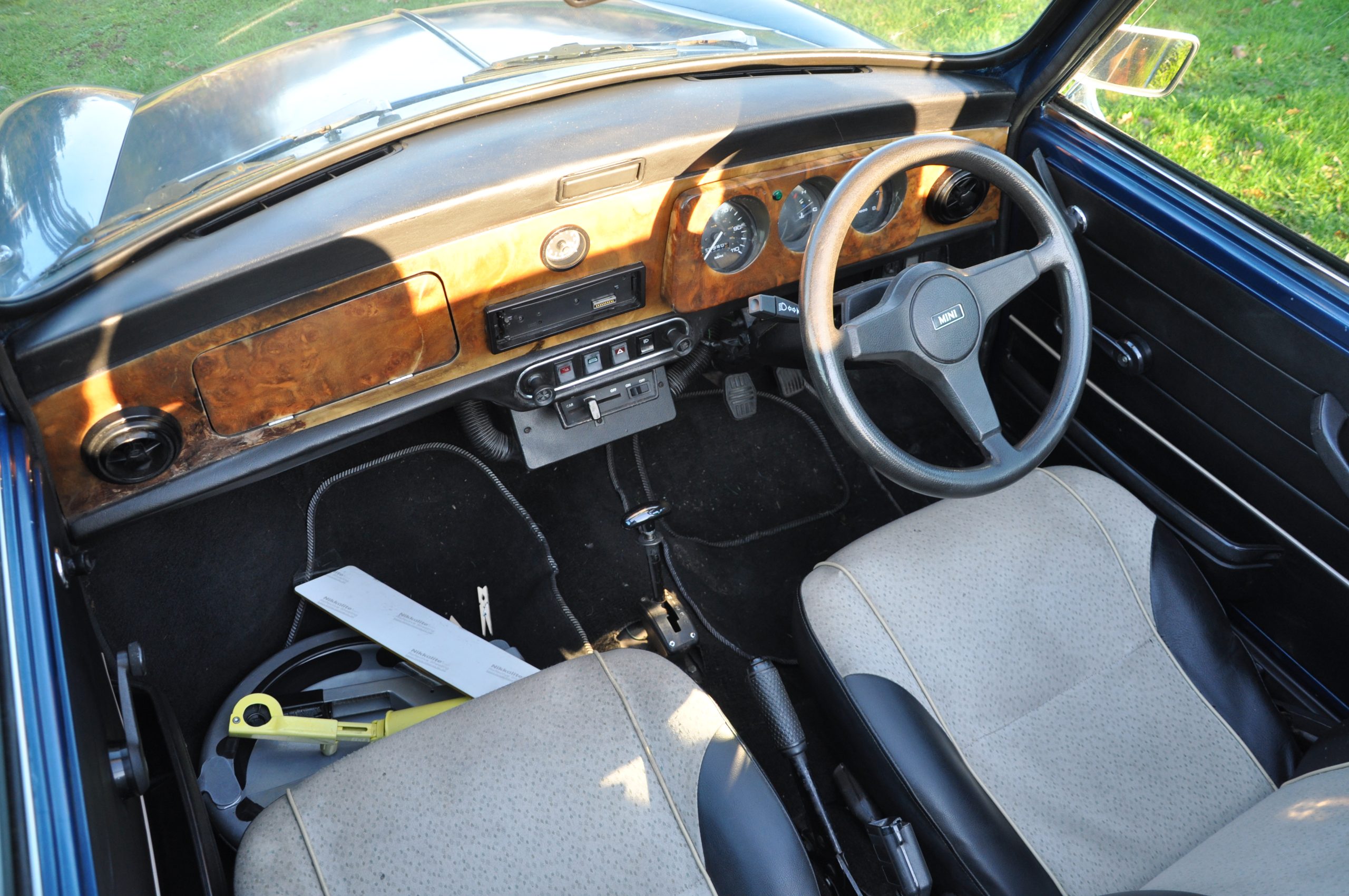 “Bluebelle” is a 1988 (registered very early in January 1989) Austin Mini Mayfair Automatic. She is fitted with a completely standard 998cc A+ engine and Mayfair 2.76:1 final drive. Her interior has a mk5 leather interior, along with walnut dash. Finished in a “Fantasy Blue Pearl” paint scheme with a mohair hood and cream piping to match the interior, she looks fantastic in the summer sun.